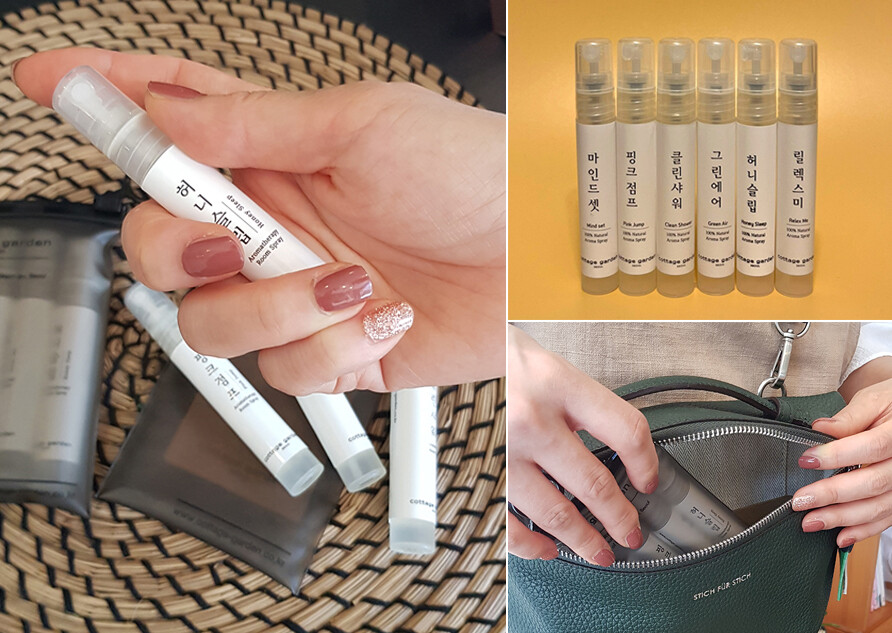 코티지가든의 베스트셀러 천연아로마스프레이 휴대용패기지 셋트입니다. 핸드백에 지갑에 쏙 들어가는 사이즈예요.